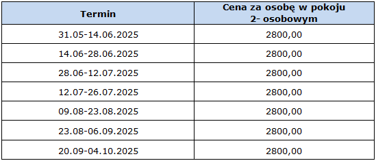- noclegi/14 dób/15 dni/ z wyżywieniem: śniadanie, obiad, deser, kolacja, z wyjątkiem dnia przyjazdu,